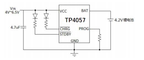 便攜式電源設(shè)備:如移動電源、充電寶等,需要在有限的空間內(nèi)實現(xiàn)高效的充電功能,同時對芯片的散熱性能和穩(wěn)定性有較高要求。TP4057的寬輸入電壓范圍和良好的散熱特性使其成為理想的選擇。TP4057典型應(yīng)用圖如下所示~