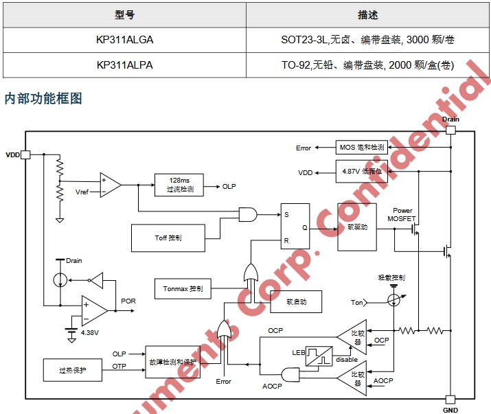 KP311AWPA具備一系列智能控制和保護功能,確保了芯片在各種工作條件下的穩(wěn)定性和安全性。芯片內(nèi)部設(shè)計有軟啟動電路,能夠在啟動時逐漸增加過流保護閾值,避免了啟動瞬間的電流沖擊。此外,還集成了VDD欠壓保護、逐周期電流限制、異常過流保護、過熱保護、過載保護等多種保護功能,全方位保障了芯片及外部電路的安全運行。