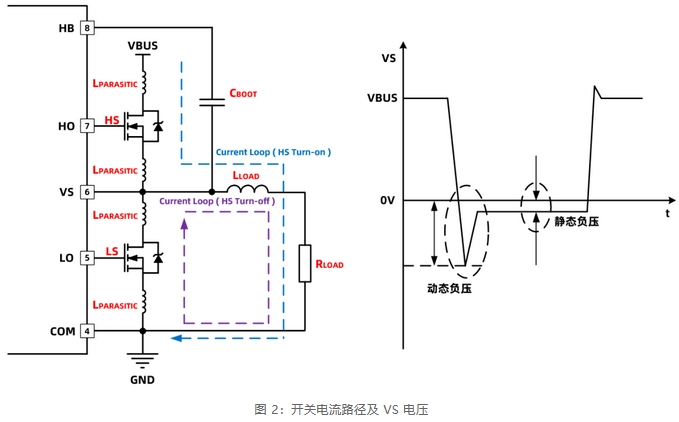 當(dāng)控制信號HIN為高電平,LIN為低電平時,高側(cè)功率器件導(dǎo)通,低側(cè)功率器件關(guān)閉,電流從輸入端流向負(fù)載。