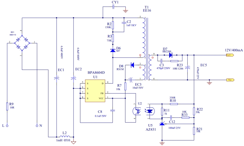 BPA8604D的電路設計簡潔而高效,充分體現(xiàn)了其高度集成化的特點。從電路圖中可以看出,整個電源電路主要由輸入濾波、整流橋、變壓器、反饋電路和輸出濾波等部分組成。輸入濾波部分采用了電解電容和貼片電容的組合,能夠有效濾除輸入電壓中的高頻噪聲,為后續(xù)電路提供穩(wěn)定的輸入電壓。