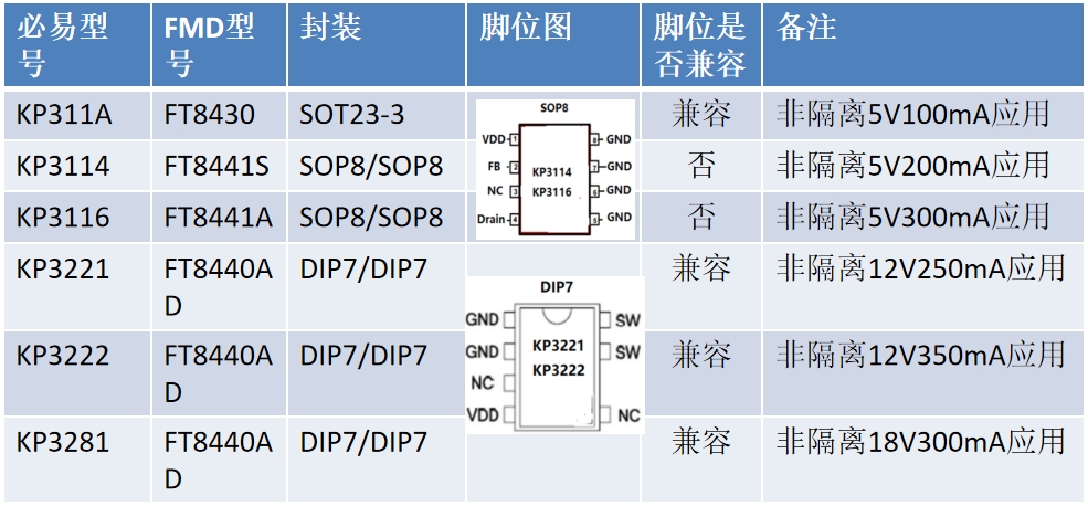必易微的KP3221和KP3222型號與FT8440AD在封裝和腳位上兼容。KP3221是非隔離12V250mA應用,KP3222是非隔離12V350mA應用,FT8440AD能夠完美替代這兩款型號,為用戶提供更加高效和可靠的電源解決方案。