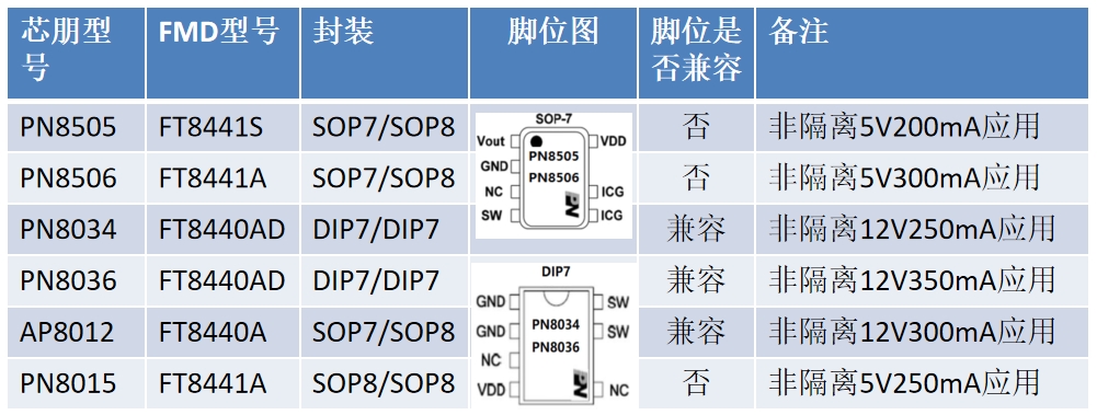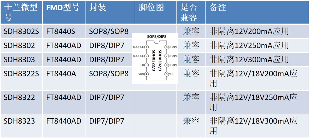 士蘭微的SDH8302S、SDH8302、SDH8303、SDH8322S、SDH8322和SDH8323型號與FT8440系列芯片在封裝和腳位上兼容。這些型號涵蓋了非隔離12V200mA、12V250mA、12V300mA以及12V/18V200mA、12V/18V250mA、12V/18V300mA等多種應用,FT8440系列芯片能夠全面替代這些型號,滿足不同用戶的需求。