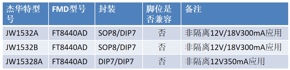 杰華特的JW1532A、JW1532B和JW15328A型號與FT8440AD在功能和性能上具有相似性。這些型號涵蓋了非隔離12V/18V300mA和12V350mA等多種應用,FT8440AD能夠替代這些型號,為用戶提供更加高效和可靠的電源解決方案。
