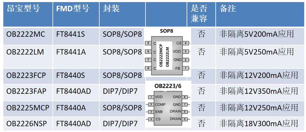 昂寶的OB2223FCP和OB2223FAP型號與FT8440S和FT8440AD在功能和性能上具有相似性。雖然在封裝和腳位上不完全兼容,但通過簡單的電路調整,FT8440系列芯片可以替代這兩款型號,為用戶提供更加高效和可靠的電源解決方案。