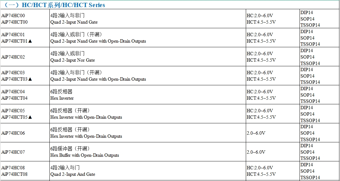 LV(低電壓)和LVC(低電壓CMOS)系列適用于低功耗和低電壓應(yīng)用。國產(chǎn)AiP74LV系列和AiP74LVC系列提供了與ON Semiconductor等廠商相同的功能和性能。例如,AiP74LV04(6路反相器)與ON Semiconductor的MC74LV04在工作電壓(1.65~5.5V)、傳播延遲(5ns)和封裝形式(DIP14, SOP14, TSSOP14)上完全兼容。