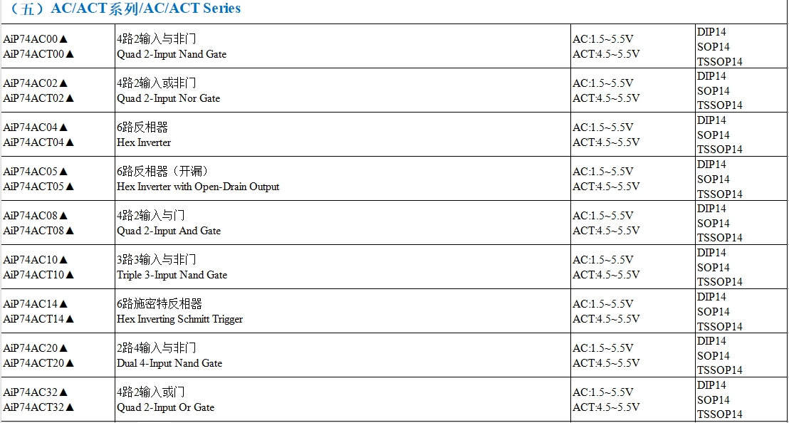AC(先進(jìn)CMOS)和ACT(先進(jìn)CMOS TTL兼容)系列適用于高速應(yīng)用。國產(chǎn)AiP74AC系列和AiP74ACT系列在高速性能上與進(jìn)口產(chǎn)品相當(dāng)。例如,AiP74AC00(4路2輸入與非門)與TI的SN74AC00在工作電壓(1.5~5.5V)、傳播延遲(3ns)和封裝形式(DIP14, SOP14, TSSOP14)上完全兼容。