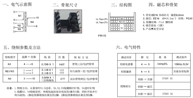 變壓器作為電源適配器中的關鍵部件,其性能直接影響電源轉換效率與輸出穩定性。該適配器采用 EE16 型號的變壓器,初級與次級繞組匝數比為 140:21,電感量設定為 2mH,磁芯有效截面積為 19.2mm2。