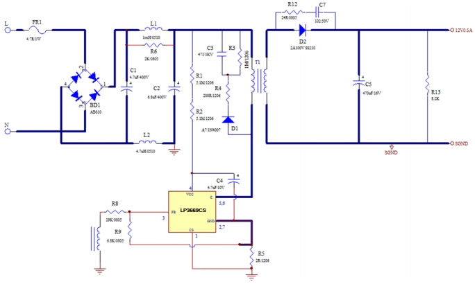 LP3669CS+SS210 12V0.5A電源適配器性能剖析(電路及板實物圖)