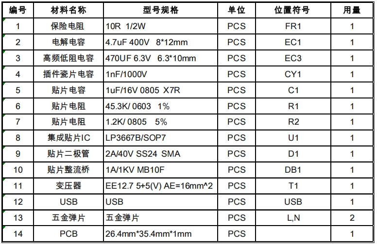 物料清單是實(shí)現(xiàn)電路設(shè)計(jì)的基礎(chǔ),它詳細(xì)列出了電路中所使用的各種元件及其規(guī)格型號(hào)。在 LP3667B 5V1A 充電器的 BOM 表中,涵蓋了保險(xiǎn)電阻、電解電容、高頻低阻電容、瓷片電容、貼片電阻、集成貼片 IC、貼片二極管、貼片整流橋、變壓器、USB 接口、五金彈片以及 PCB 等多種元件。例如,保險(xiǎn)電阻采用 10R 1/2W 的規(guī)格,用于電路的過(guò)流保護(hù);電解電容選用 4.7uF 400V 的型號(hào),用于輸入濾波;高頻低阻電容則采用 470uF 6.3V 的規(guī)格,用于輸出濾波,以降低輸出紋波。這些元件的合理選型和搭配,共同構(gòu)成了一個(gè)高效、穩(wěn)定的充電器電路。