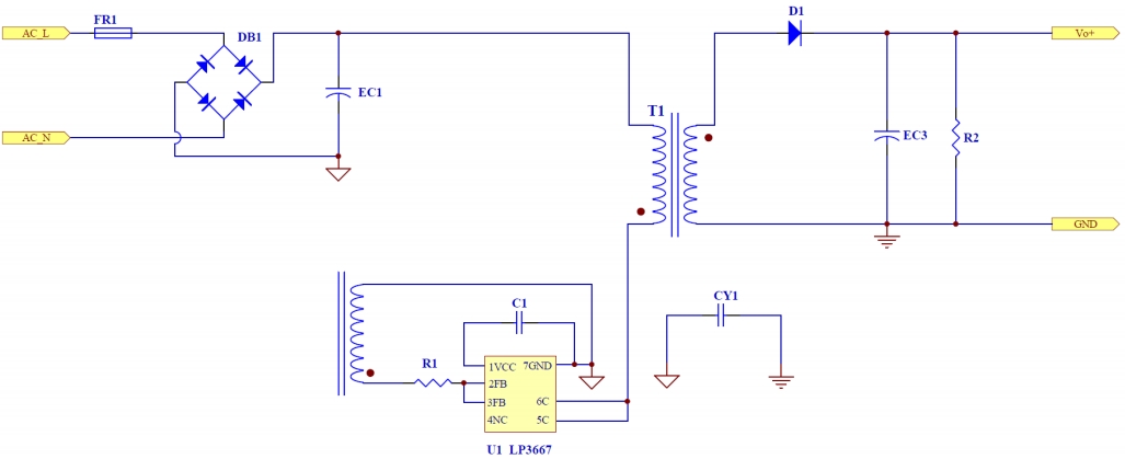 充電器的電路設(shè)計(jì)是其核心部分,其電路圖展示了各個(gè)元件的連接關(guān)系和功能。從電路圖中可以看出,該設(shè)計(jì)采用了典型的開關(guān)電源架構(gòu),主要包括輸入整流濾波電路、主控芯片 LP3667B、變壓器 T1、輸出整流濾波電路以及保護(hù)電路等關(guān)鍵部分。輸入整流濾波電路將交流輸入轉(zhuǎn)換為直流,并通過(guò)濾波電容去除高頻噪聲,為后續(xù)電路提供穩(wěn)定的直流輸入。主控芯片 LP3667B 作為整個(gè)充電器的“大腦”,負(fù)責(zé)控制開關(guān)頻率、占空比以及實(shí)現(xiàn)各種保護(hù)功能,確保充電過(guò)程的安全與高效。變壓器 T1 是實(shí)現(xiàn)電壓轉(zhuǎn)換和電氣隔離的關(guān)鍵元件,其三繞組結(jié)構(gòu)能夠有效降低電磁干擾并提高轉(zhuǎn)換效率。輸出整流濾波電路則將變壓器次級(jí)輸出的高頻脈沖轉(zhuǎn)換為穩(wěn)定的直流輸出,并通過(guò)濾波電容去除輸出紋波,保證輸出電壓的純凈度。