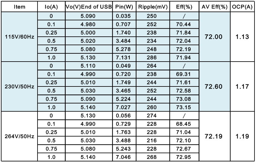 效率是衡量充電器性能的重要指標(biāo)之一。根據(jù)測(cè)試數(shù)據(jù),在不同輸入電壓和負(fù)載條件下,該充電器的效率表現(xiàn)較為出色。例如,在輸入電壓為 115Vac/60Hz 時(shí),滿載效率達(dá)到 72.00%;而在輸入電壓為 230Vac/50Hz 時(shí),滿載效率為 72.60%。這表明充電器在不同工作條件下都能保持較高的轉(zhuǎn)換效率,減少了能量損耗,提高了能源利用率。
