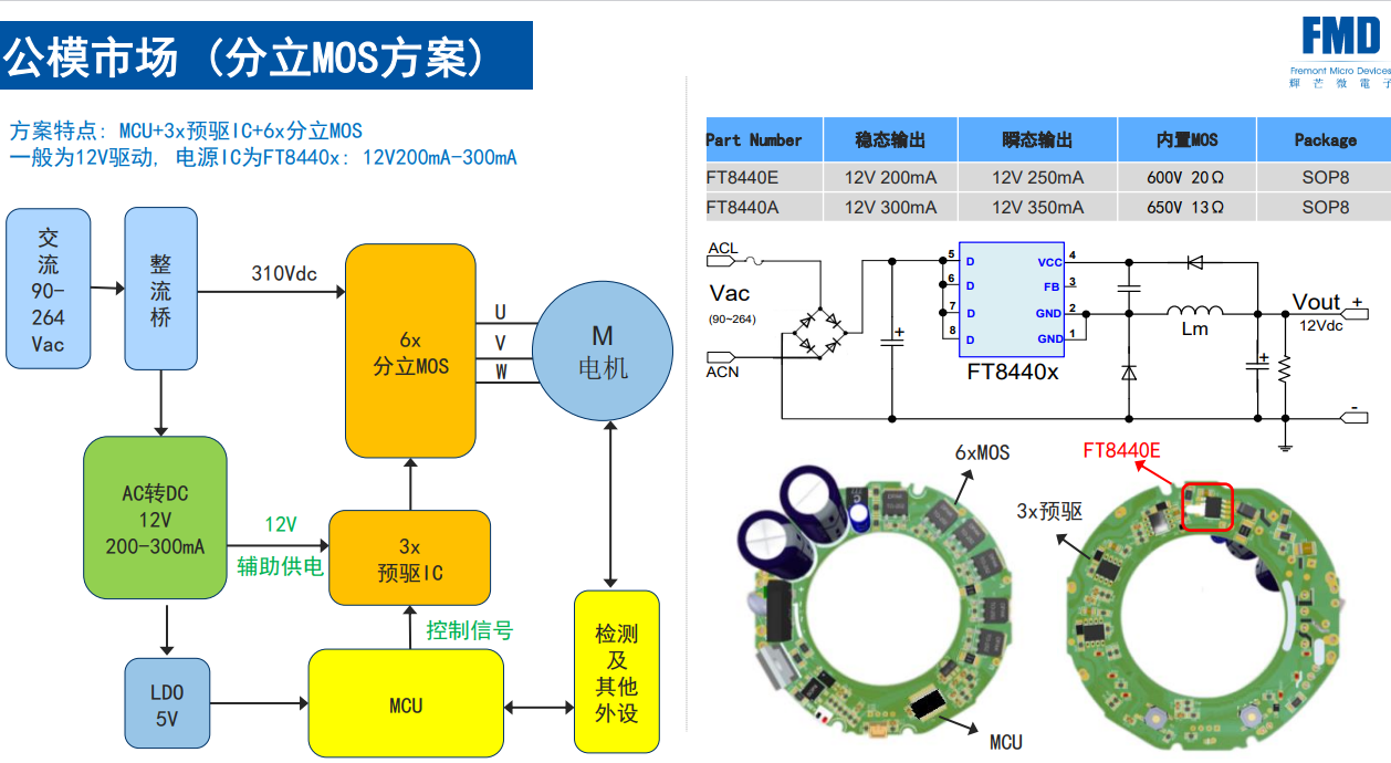 分立MOS方案是公模市場(chǎng)中常見(jiàn)的設(shè)計(jì)方案,其核心在于采用MCU(微控制器)+3x預(yù)驅(qū)IC(預(yù)驅(qū)動(dòng)集成電路)+6x分立MOS(金屬氧化物半導(dǎo)體場(chǎng)效應(yīng)晶體管)的組合。這種方案通常用于12V驅(qū)動(dòng)的吹風(fēng)筒,電源IC選用FT8440x,能夠提供12V200mA至300mA的穩(wěn)定輸出。