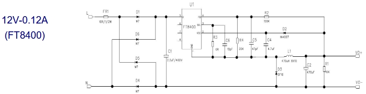FT8400是一款可調(diào)節(jié)輸出電壓的AC-DC恒壓芯片,支持5V、9V、12V等多種輸出電壓。其典型電路如下圖所示: