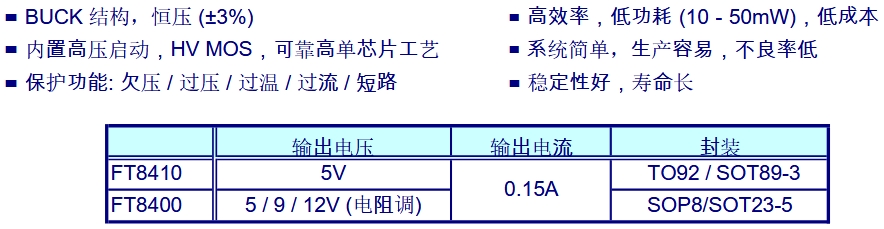 FT8400與FT8410是專為AC-DC轉(zhuǎn)換設(shè)計(jì)的恒壓芯片,采用了先進(jìn)的BUCK結(jié)構(gòu),能夠?qū)崿F(xiàn)高效率的電壓轉(zhuǎn)換。它們支持六級能效標(biāo)準(zhǔn),確保在各種負(fù)載條件下都能保持出色的能效表現(xiàn)。這兩款芯片內(nèi)置高壓啟動功能和高壓MOSFET,采用了可靠的單芯片工藝,集成了欠壓、過壓、過溫、過流和短路保護(hù)功能,確保了系統(tǒng)的穩(wěn)定性和安全性。
