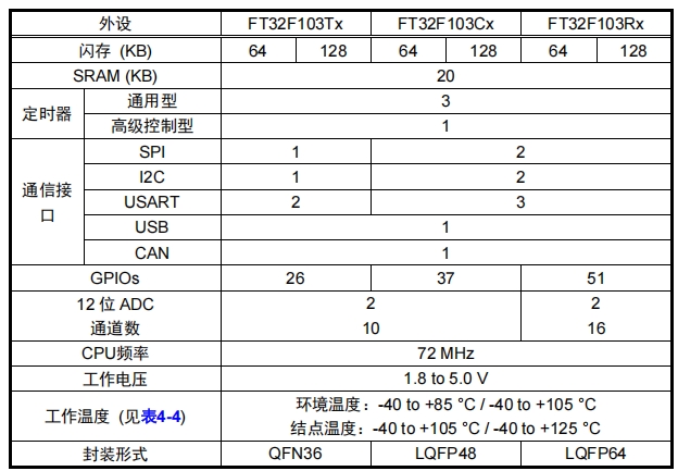 FT32F103x8/B 微控制器集成了高性能的 Arm? Cortex?-M3 32 位 RISC 內(nèi)核,工作頻率為 72 MHz,內(nèi)嵌高速存儲器 (高達(dá) 128 KB 的閃存和 20 KB 的 SRAM),以及大量的增強(qiáng)型 I/O 和連接到兩條 APB總線的外設(shè)。所有器件都提供兩個(gè) 12 位 ADC、三個(gè)通用 16 位定時(shí)器和一個(gè) PWM 定時(shí)器,以及標(biāo)準(zhǔn)和先進(jìn)的通信接口:多達(dá)兩個(gè) I2C、兩個(gè) SPI、 三個(gè) USART、一個(gè) USB 和一個(gè) CAN。