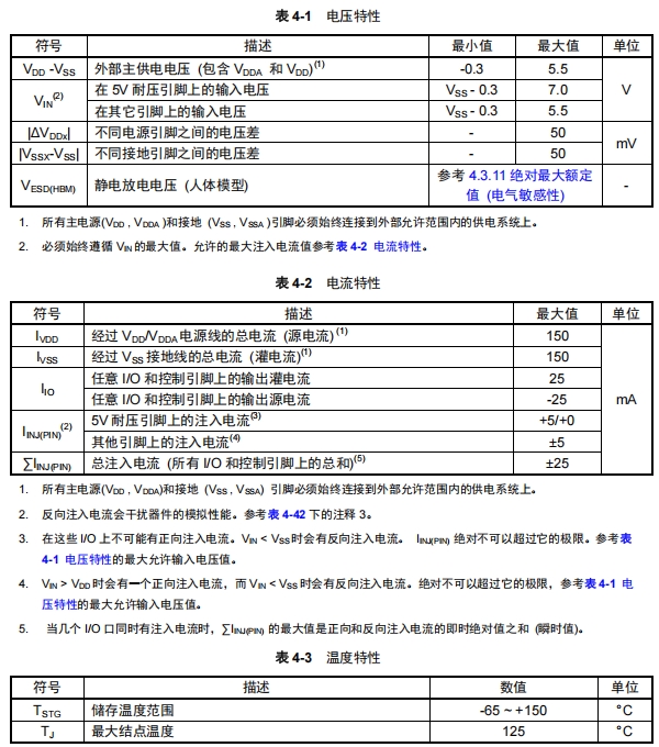 表4-1列出了電壓特性,表4-2列出了電流特性,表4-3列出了溫度特性。這些數(shù)據(jù)對于確保器件在安全范圍內(nèi)工作至關(guān)重要。