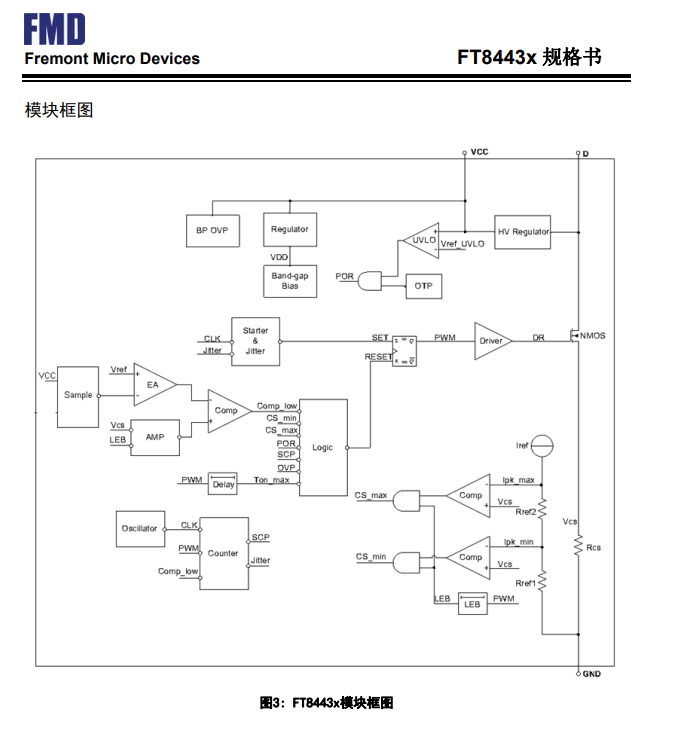 FT8443x采用超高壓工藝,內部集成高壓啟動電路,高壓功率開關,以及電流采樣電阻,減少了外部元器件,極大地簡化了系統(tǒng)應用。內置的頻率抖動和軟驅動設計能有效提高EMI性能。