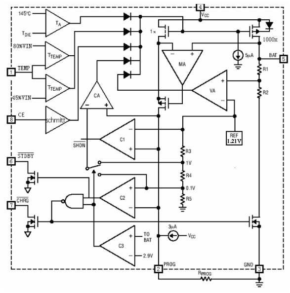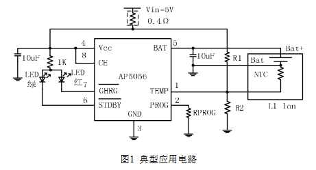 充電電壓被固定在4.2V,充電電流可通過外部電阻設(shè)置。當充電電流在達到最終浮充電壓之后降至設(shè)定值 1/10 時,AP5056 將自動終止充電循環(huán)。當輸入端(適配器或USB電源)拔掉后,AP5056自動進入低電流狀態(tài),電池漏電流將降到2μA以下。AP5056還可被設(shè)置于停機狀態(tài),使電源電流降到50μA。其余特性包括:電池溫度監(jiān)測,欠壓鎖閉,自動再充電和兩個狀態(tài)引腳以顯示充電和充電終止。