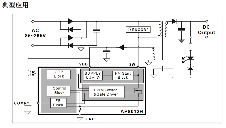 AP8012H芯片內部集成了脈寬調制控制器和功率MOSFET,適用于小功率離線式開關電源。該芯片提供了完整的智能化保護功能,包括過流保護,欠壓保護,過壓保護,過溫保護和軟啟動功能。間歇工作模式能夠降低系統(tǒng)處于待機模式時的功耗;抖頻技術有助于EMI特性。該芯片還內置高壓啟動模塊,保證系統(tǒng)能迅速啟動。