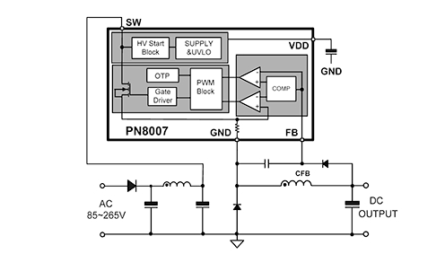 PN8007集成PFM控制器及650V高可靠性MOSFET,用于外部元器件極精簡的小功率非隔離開關電源。 PN8007內(nèi)置650V高壓啟動,實現(xiàn)系統(tǒng)快速啟動、超低待機功能。該芯片提供了完整的智能化保護功能,包括過載保護,欠壓保護,過溫保護。另外PN8007具有優(yōu)異的EMI特性。