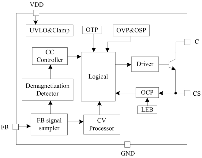 PL3376C是一款原邊控制,用于反激式開(kāi)關(guān)電源的恒流/恒壓調(diào)節(jié)器。其高度集成了功率開(kāi)關(guān),并通過(guò)去除光耦以及次級(jí)控制電路,在簡(jiǎn)化充電器/適配器等傳統(tǒng)的恒流/恒壓設(shè)計(jì)的同時(shí)實(shí)現(xiàn)了精確的電流和電壓調(diào)節(jié),內(nèi)部框架圖如下所示。