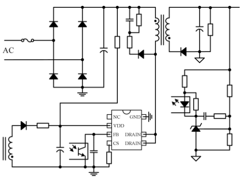 芯片通過對(duì)輸出采樣并反饋到光耦獲得高精度的恒壓輸出。內(nèi)置的斜率補(bǔ)償電路確保了峰值電流模控制的穩(wěn)定性。內(nèi)部集成的頻率抖動(dòng)功能可以改善EMC,降低EMI濾波成本。