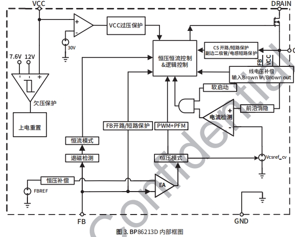 BP86213D 芯片集成650VMOSFET、高壓啟動和供電電 保護功能 路。采用PWM/PFM多模式控制技術(shù),從輔助繞組給VCO 輸入欠壓保護(Brown-in/out) 供電,能有效降低系統(tǒng)待機功耗,提高效率和動態(tài)性能, 并減小系統(tǒng)工作在輕載時的噪聲。
