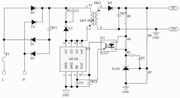 DK106芯片是專用小功率開關(guān)電源控制芯片,廣泛用于電源適配器、LED電源、電磁爐、 空調(diào)、DVD等小家