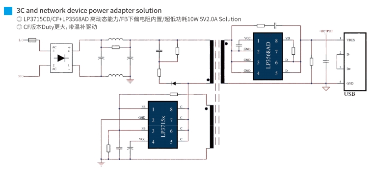 在3C(計算機、通信和消費電子)設(shè)備和網(wǎng)絡(luò)設(shè)備的電源適配器領(lǐng)域,10W的輸出功率是一個常見的需求點。為了滿足這一需求,LP3715系列提供了多種解決方案,這些方案不僅能夠提供穩(wěn)定的電源輸出,還能根據(jù)不同的應(yīng)用場景提供定制化的功能。本文將詳細(xì)介紹LP3715系列在10W電源適配器中的應(yīng)用,包括其技術(shù)規(guī)格、特點以及推薦的應(yīng)用場景。