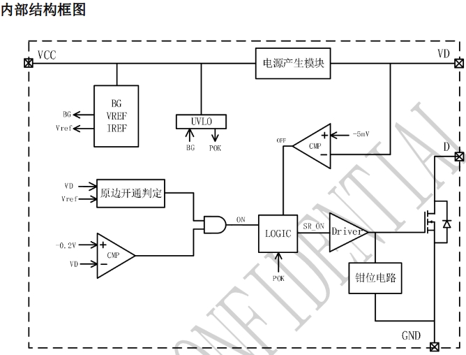 LP15R060S的內(nèi)部結(jié)構(gòu)框圖揭示了其復(fù)雜的內(nèi)部電路設(shè)計。電源產(chǎn)生模塊、BG(帶隙參考)、VREF(參考電壓)、IREF(參考電流)等關(guān)鍵部件共同工作,確保芯片的穩(wěn)定運行。此外,芯片還包含原邊開通判定、鉗位電路、比較器等,這些部件協(xié)同工作,實現(xiàn)對同步整流管的精確控制。