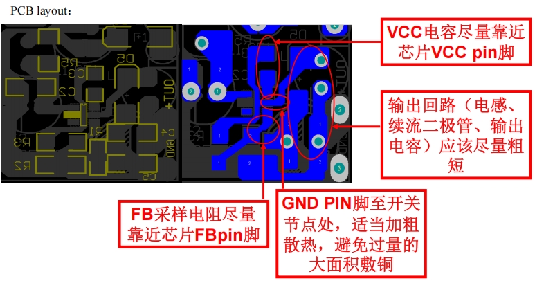 VCC電容應盡量靠近芯片VCC引腳,輸出回路(電感、續流二極管、輸出電容)應盡量粗短,FB采樣電阻應盡量靠近芯片FB引腳,GND引腳至開關節點處,適當加粗散熱,避免過量的大面積敷銅。
