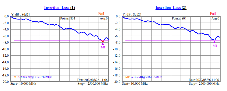 我們以ph0.5-51p-300lvds排線來說明。0.5x51x300xA兩面不貼復合鋁箔,測試結果如下圖(一),0.5x51x300xA單面貼復合鋁箔,測試結果如下圖(二)。