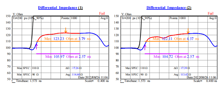 從圖一與圖二數據可以看出,不貼復合鋁箔,排線的特性阻抗平均值為114.6Ω和113.4Ω;貼上復合鋁箔后排線的特性阻抗平均值為96.8Ω和96Ω。而一般都要求線纜特性阻抗在100±10Ω。下圖七與圖八是不貼復合鋁箔與貼上復合鋁箔排線的特性阻抗圖,顯然貼上復合鋁箔后特性阻抗的波動范圍更小,且能控制在標準范圍內。